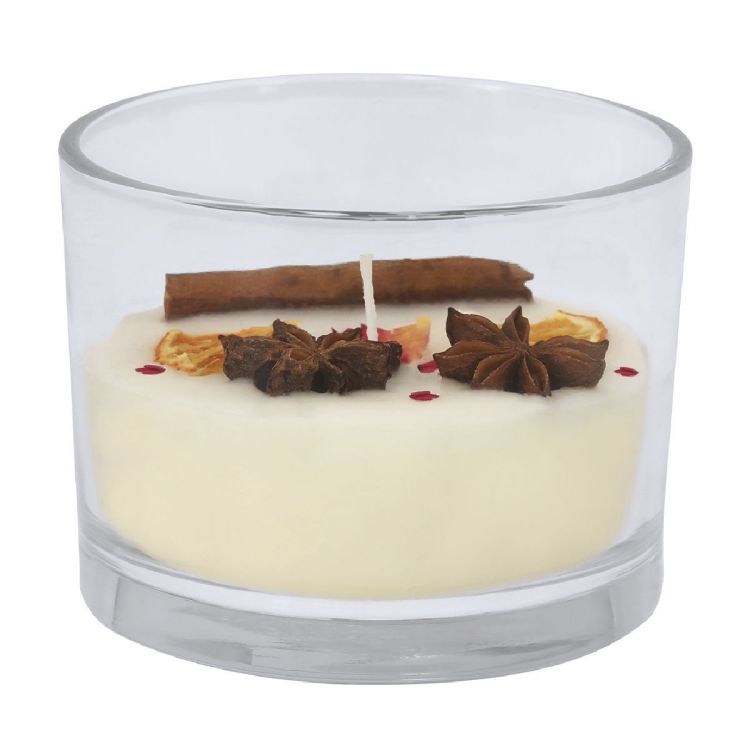 Aromatic candle made with vegetable wax and cinnamon & citrus fragrance. Decorated on top with pink flower petals, a cinnamon stick, dried orange slices and star anise. (white color)