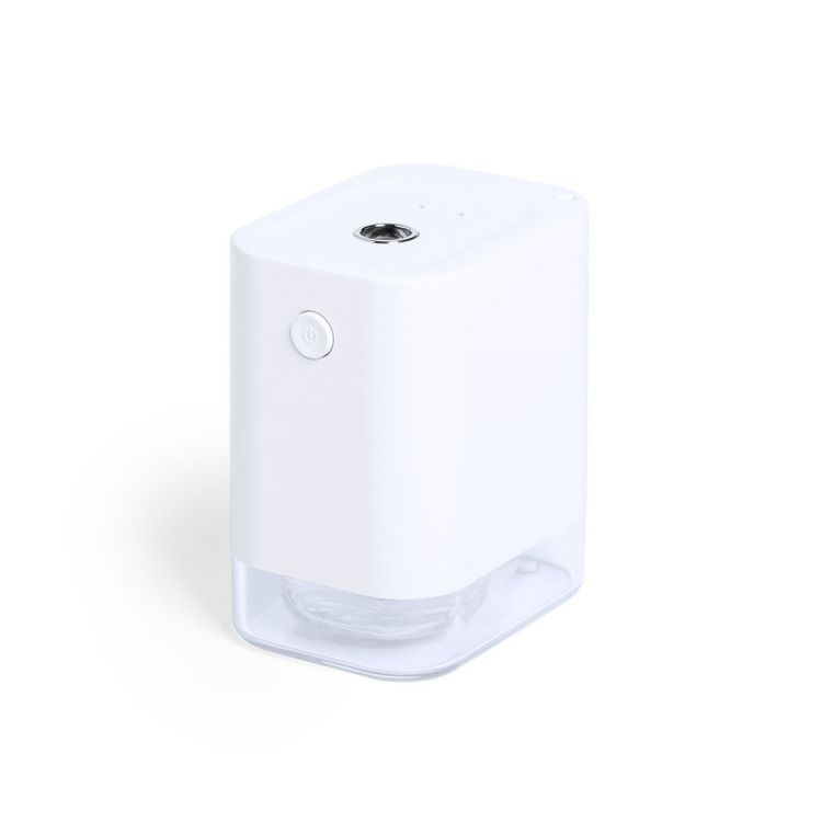Automatic alcohol dispenser for hygiene and skin cleaning, with infrared motion sensor and led indicator. Compact size and discreet matte white finish, particularly suitable for pad printing, with 45 ml deposit easily refillable (alcohol not included), plus filter and replacement metal spring. 1800 mA lithium ion battery, with electronic conversion capability ≥ 90%. Rechargeable via 1 meter length USB type C cable in matching color. Presented in an attractive design box. English and Spanish instruction manual available. (white color)