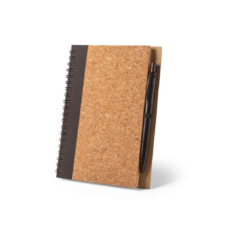 B6 notepad with hard cover made of cork and recycled polyester (100% rPET) with 140 plain pages made from 100% recycled paper (70 g/m²) Includes a pen holder and a ball pen in wheat fibre and ABS with clip. Blue writing. As the product is made from natural materials, the colour and the printing result may vary between products. Product in black color