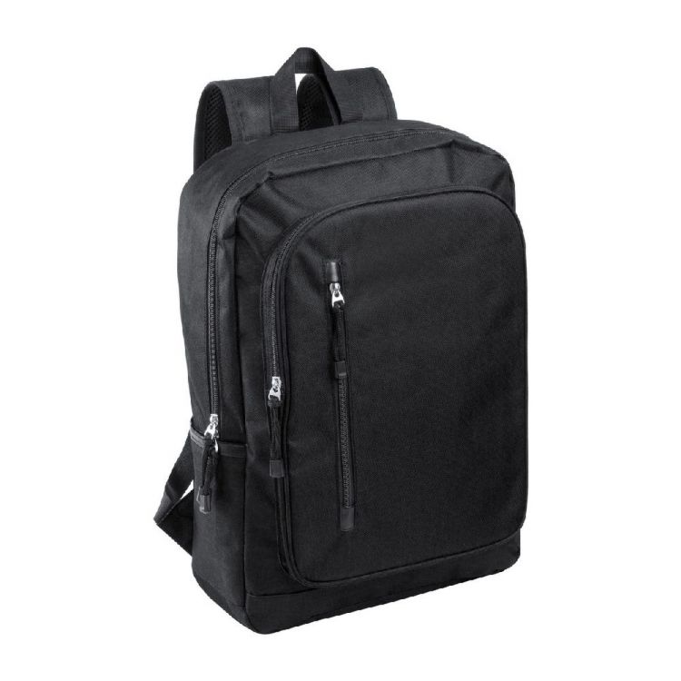 Backpack with multiple zipped compartments, padded laptop pocket (15") and adjustable straps. 600D polyester.