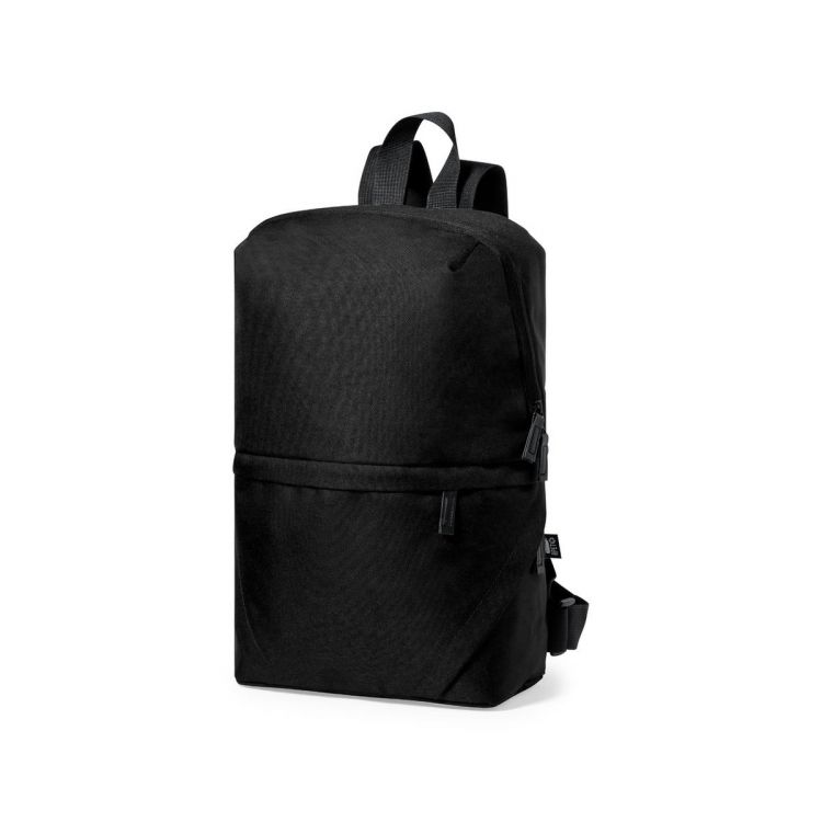 Backpack made of durable 600D RPET polyester. Main compartment with invisible zip closure, double outside pocket and adjustable shoulder straps. Available in a variety of colours, outside label with the RPET distinctive. RPET material is made from recycled plastic, to encourage the reuse of plastic waste and help the sustainability of the planet.