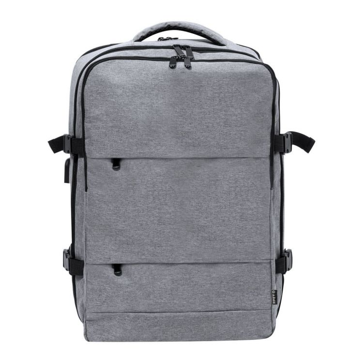 Water resistant RPET backpack with 3 zipped main compartments, 2 zipped front pockets, zipped side pocket and hidden anti-theft pocket. With padded laptop (17") and shoe compartments, padded back and shoulder straps. With trolley strap and built-in USB connection for power banks. 300D RPET polyester with distinctive RPET label.