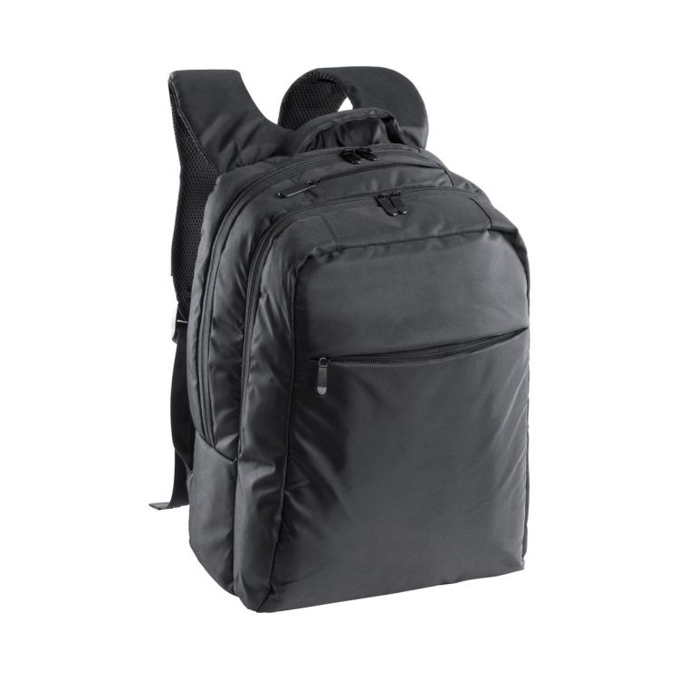 Backpack with multiple zipped compartments, ergonomic back, padded shoulder straps and laptop compartment (15"). 600D nylon.