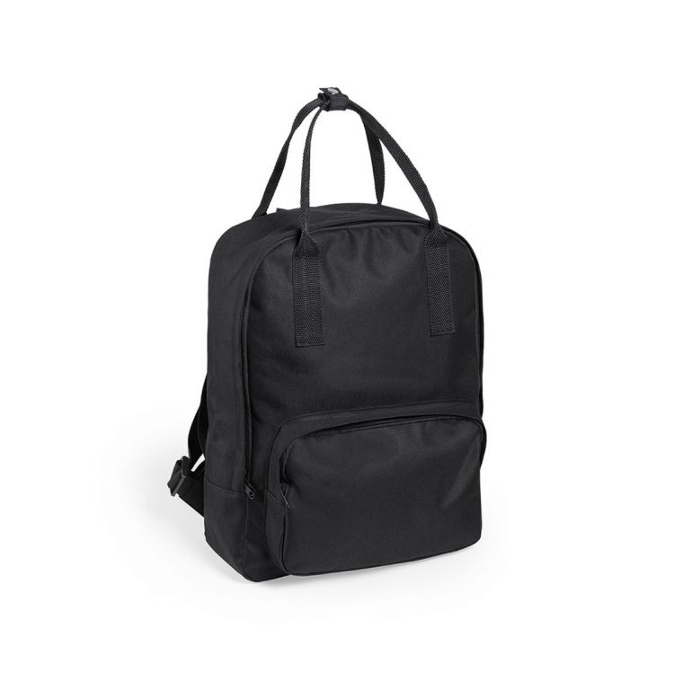 600D polyester backpack in bold urban design, with resistant matching color handles, zipper closure set and front pocket.