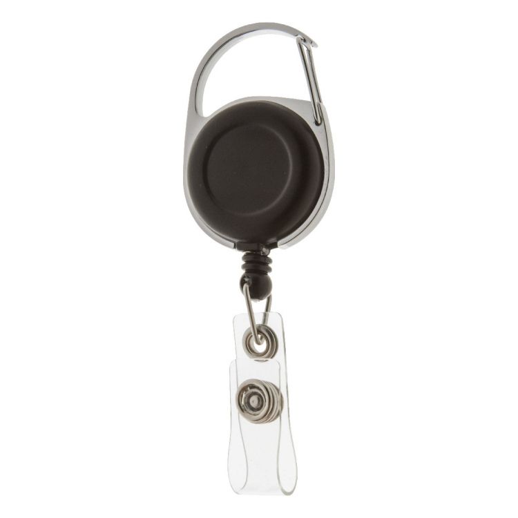 Metal and plastic badge holder with telescopic line and carabiner, in black color