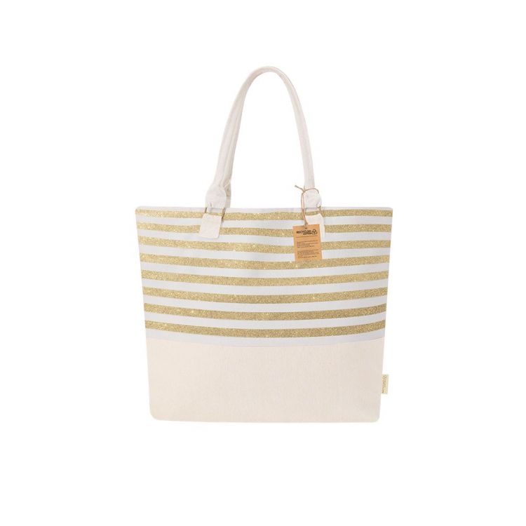 Bag made of recycled cotton of 210 g/m2. White striped design combined with golden glitter stripes and smooth natural colored part. Long cord style handles, reinforced with metal rings. Includes exterior label with recycled cotton mark. (gold color)