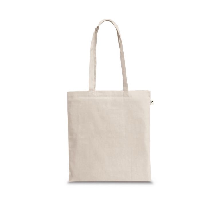 Bag made from recycled cotton (70%) and polyester (30% rPET) (150 g/m²), with 65 cm handles. Recycled cotton is solid-colored and undyed. The raw material is used in its original form and color, without the use of dyeing or bleaching chemicals, contributing to a lower impact. The solid color is obtained by choosing recycled yarn with the same shade, and impurities and color variations may appear. Product in neutral color