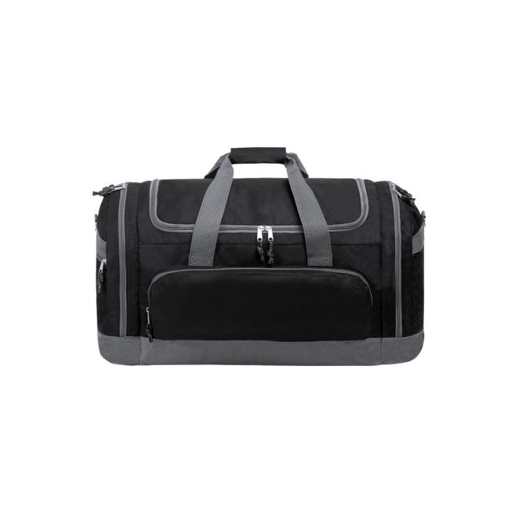 Multipurpose bag of high capacity in resistant 600D polyester. Two-colour design, with grey base and details. Main compartment and side pockets with zip closure. Resistant, nylon carrying handles with matching color velcro closure. Includes adjustable shoulder strap with carabiner closure and matching shoulder pad. Reinforced base.