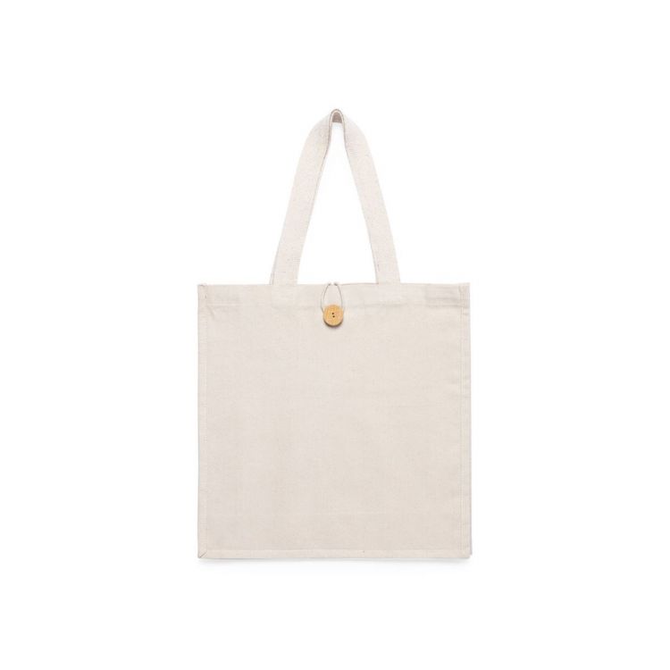 Bag made in cotton, natural finish and extra weight of 310g/m2. With original button closure, stitched finish and gusset. Extra wide and reinforced medium handles (60 x 3,5 cm). Resistance up to 10 kg weight. (neutral color)