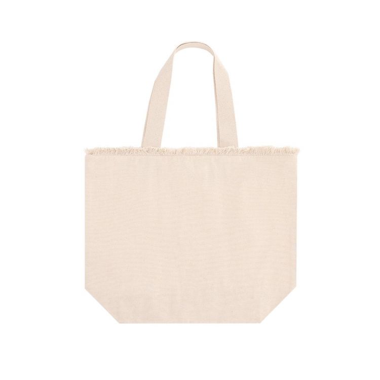 Bag with fringe style made mainly of 320 g/m2 cotton. With practical and modern design, it incorporates reinforced long handles. Includes zipper closure for added security. (neutral color)