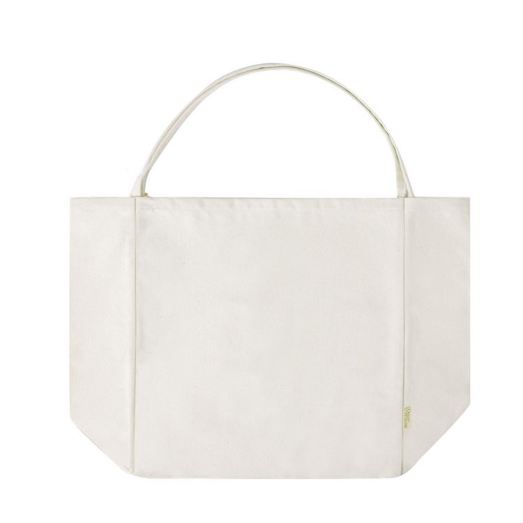 Bag in recycled cotton material 300 g/m2. Long handles of 60cm with reinforcement, stitched finish and gusset. Recycled cotton label and resistance up to 12 kg in weight. Available in natural colour. (neutral color)