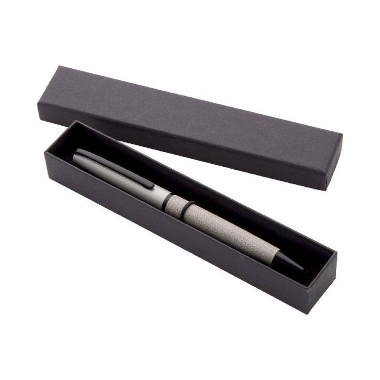 Elegant, metal twist ballpoint pen with PU leather covered barrel and black parts. In black gift box. With blue refill.