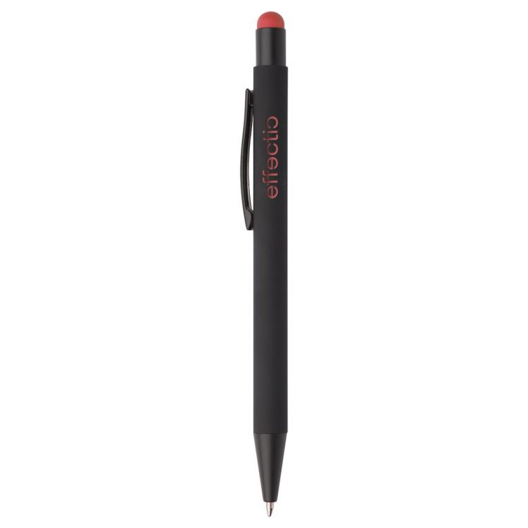 Aluminium ballpoint and touch screen pen with rubberized finish. With special coating for mirror engraving matching the stylus colour. With blue refill.