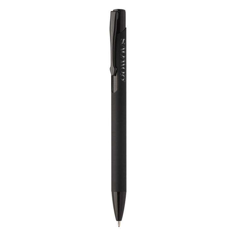 Recycled aluminium ballpoint pen with rubberized body and coloured shiny metallic finish parts. With special coating for mirror engraving matching the metallic parts. With blue refill.