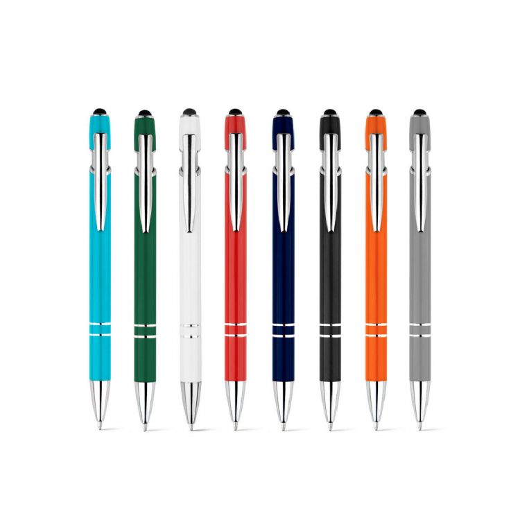 Ballpoint pen in recycled aluminium (100% rAL), with touch tip at the top of the pen. Blue ink