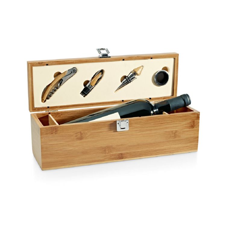 Bamboo, zinc and stainless steel wine set. This set includes: corkscrew with sommelier knife, drip stopper, pourer with lid and stopper. As the product is made from natural materials, the colour and the printing result may vary between products. Product in neutral color
