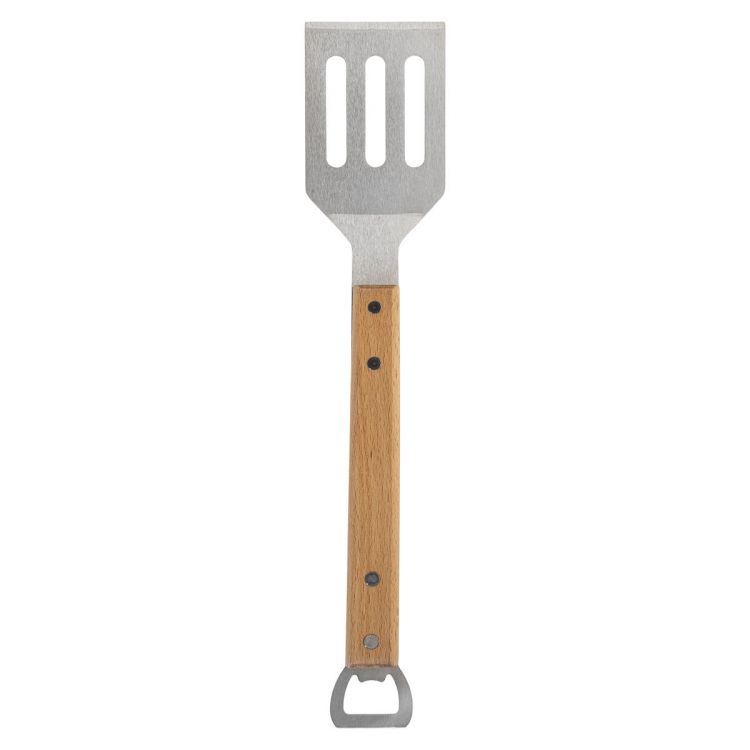 Stainless steel barbecue spatula with wooden handle and bottle opener
