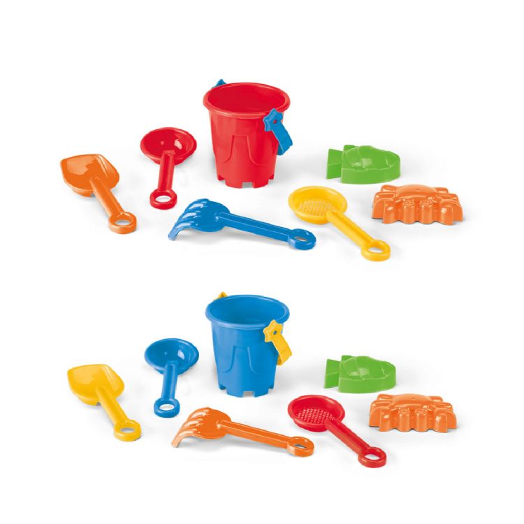 PP beach bucket with 6 beach accessories ideal for playing in the sand. The 6 accessory pieces may vary in color, with only the color of the beach bucket being fixed