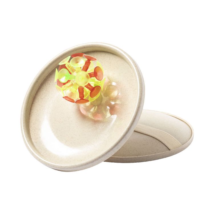 Beach game, including balls with suction cups and flat disc paddles in wheat straw plastic with elastic strap, in neutral color