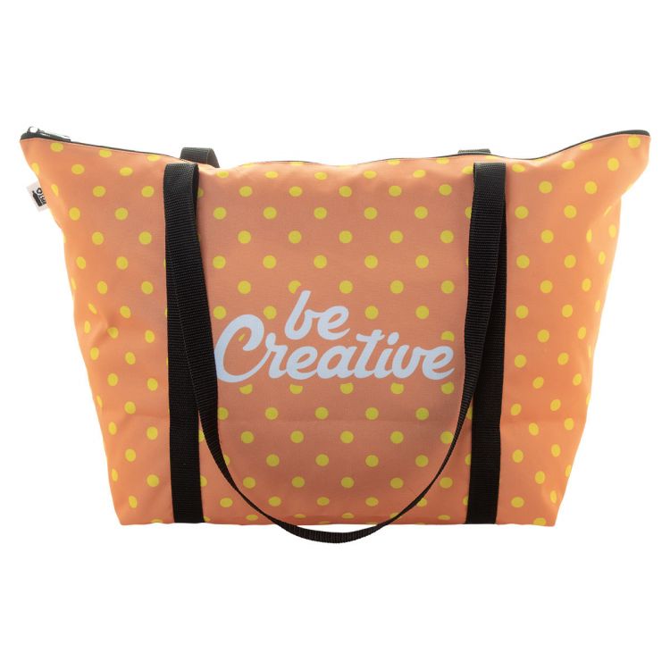 Custom made, zipped beach bag in 600D RPET polyester with long handles. With all over sublimation printed graphics and distinctive RPET label. MOQ: 25 pcs.