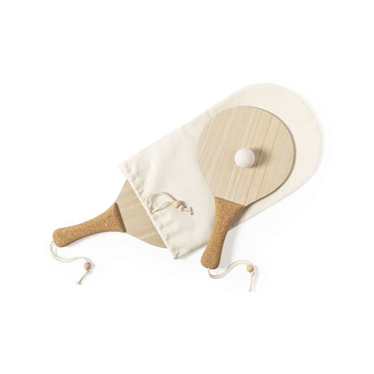 Pair of beach rackets of nature line. Made of wood, with natural cork reinforced handle and wrist straps with adjuster. Presented in a natural cotton bag with drawstring closure, including wheat straw ball. (neutral color)