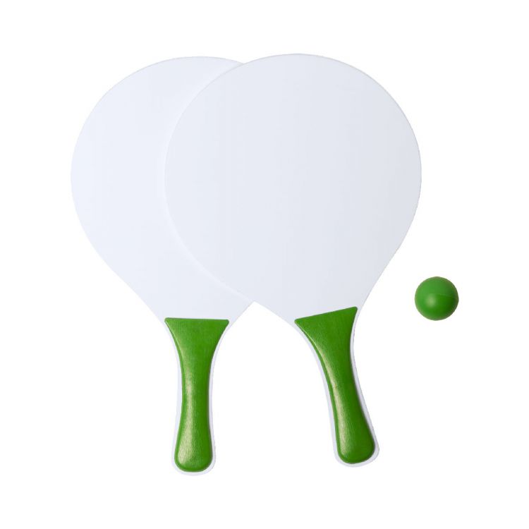 Beach tennis with 2 large rackets and one ball, made of wood and plastic.