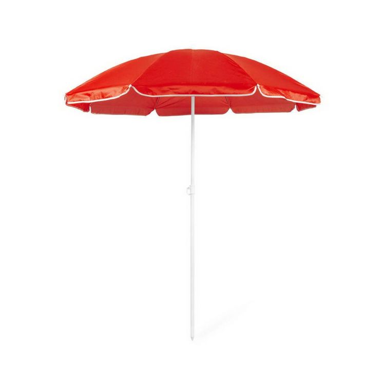 Beach umbrella of 8 panels in resistant nylon and in a varied range of bright tones. 150cm in diameter, with side skirts with piping and metal coated tubes in white color. Adjustable in height and presented in a PVC sleeve with shoulder strap.