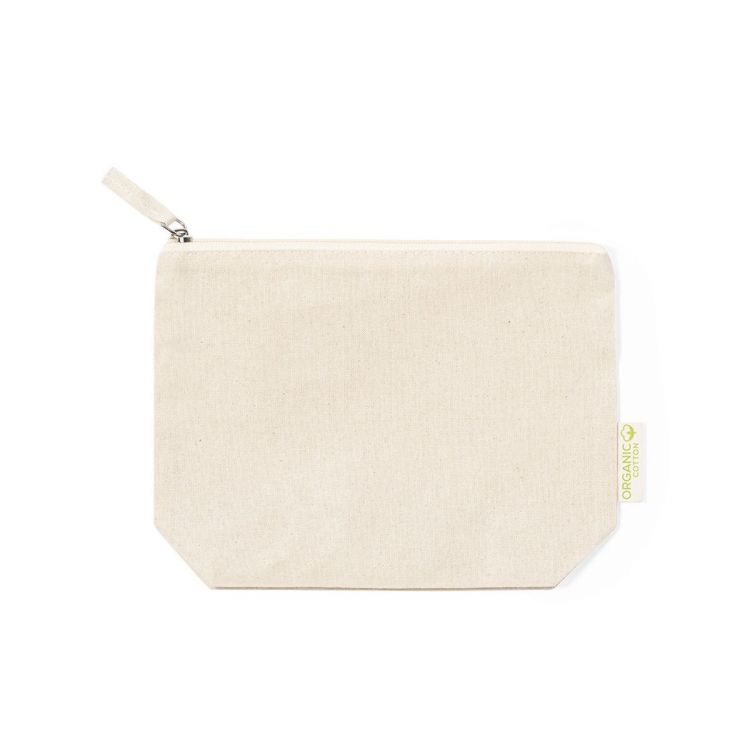 Beauty bag made of organic cotton material 175g/m2, in a natural tone. Zip closure with matching puller and eco emblem label on outside label. Including recycled cardboard hangtag with eco label. (neutral color)