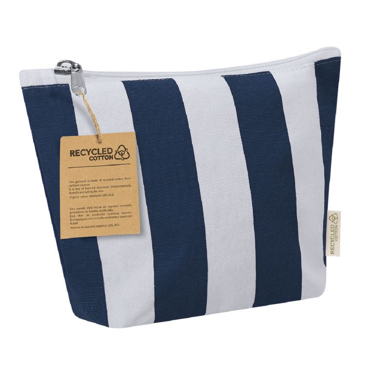 Toiletry bag made mainly of recycled cotton 220 g/ m2 in an elegant vertical striped design. Main compartment with zipper closure. Includes exterior label with recycled cotton logo.