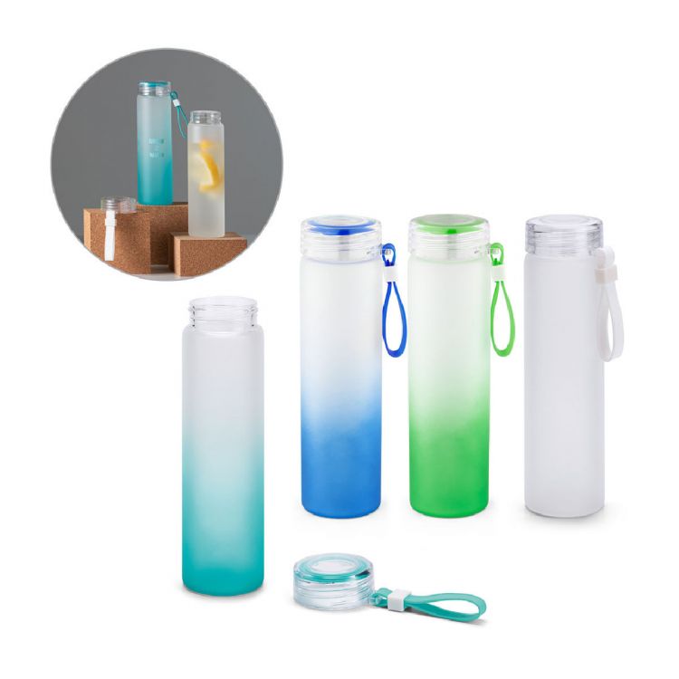 Borosilicate glass bottle with screw-on lid in AS. Bottle with a matte gradient finish and a silicone handle on the lid. Volume-capacity 470 mL. Supplied in a gift box