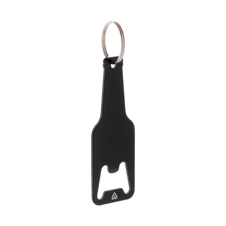 Bottle shaped recycled aluminium bottle opener with metal keyring.