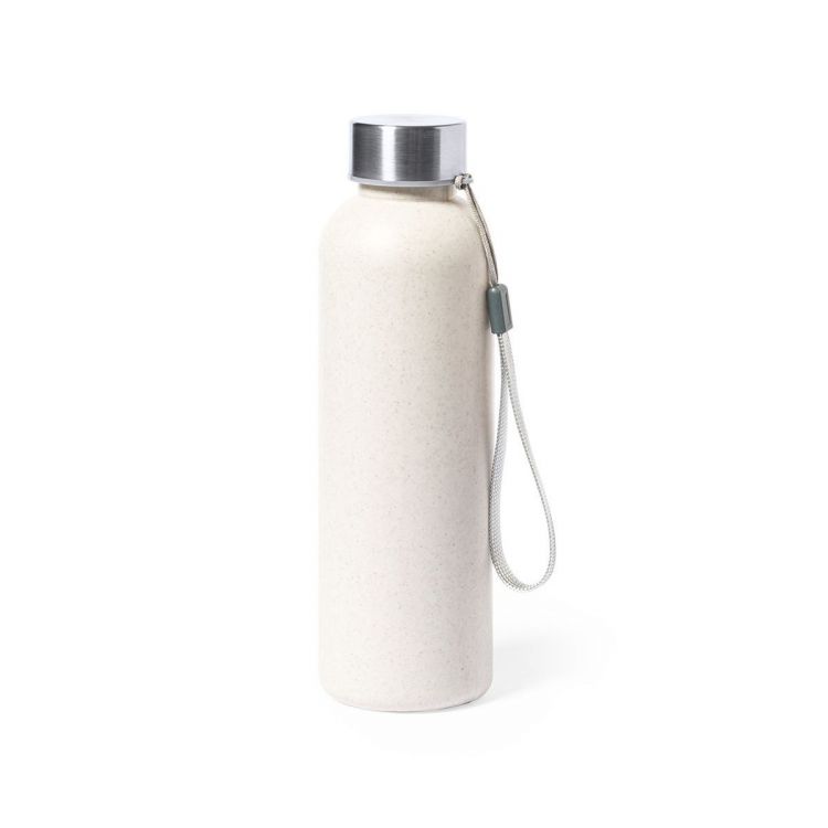 Bottle in veined PE with 600ml capacity and BPA-free. With stainless steel screw-on safety lid and carrying strap. Food Grade Certification, guaranteeing safety when the beverage is in contact with the material used to manufacture the product. (neutral color)