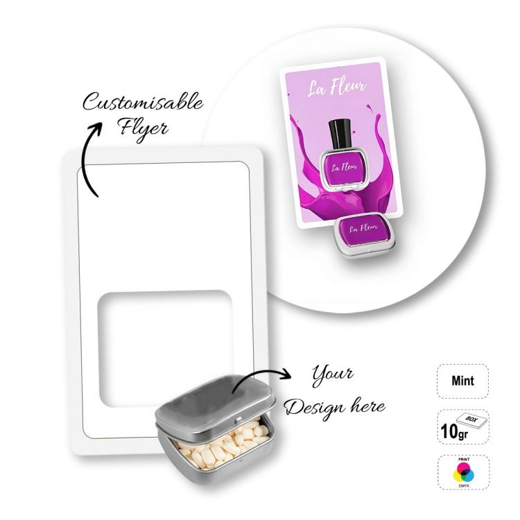 Rectangular box of mints (10 g) placed inside a rectangular cardboard flyer. The letters in the product code correspond to the size and shape of the box: A- 10 g rectangular box, B- 20 g rectangular box, C- 12 g round box. Packaging: reusable metal box, fully customisable paper flyer (paper finish: white or kraft to be chosen when ordering), pre-formed tray made from rPET. Minimum shelf life - 12 months.
