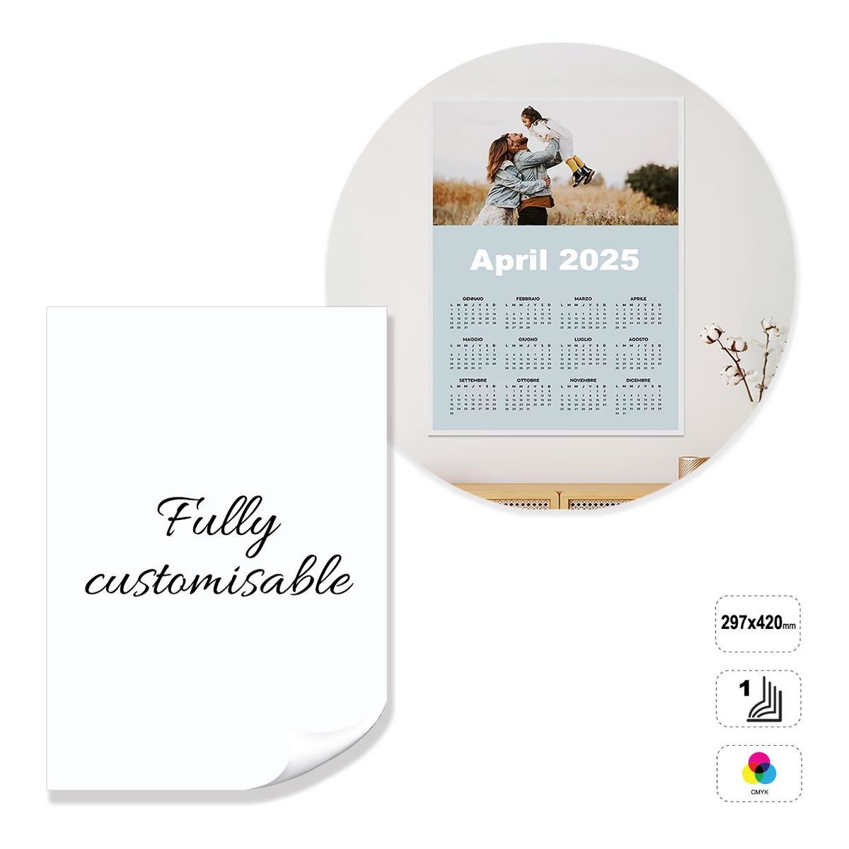 Vertical poster calendar, fully customisable. The product is made of 350 gram matt coated paper, printable on the front in full colour. Available lamination on the front with a choice of gloss, matt or soft touch. The calendar can be customised by modifying the preset template, or completely constructed following the guidelines provided in a neutral template.