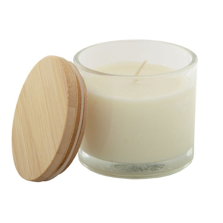 Vanilla scented plant-based wax candle in glass holder with bamboo lid. With 95 grams of wax. In kraft paper box
