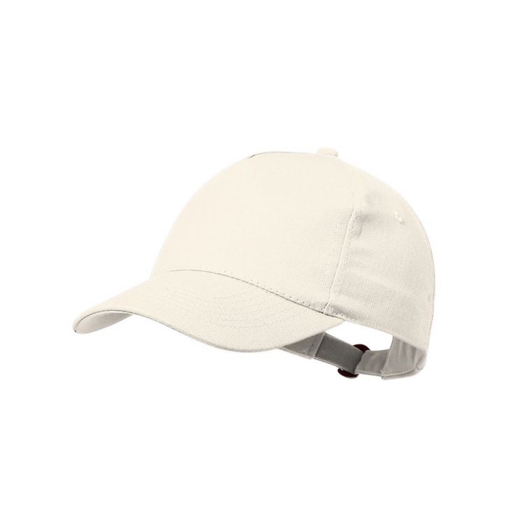 5 panel cap in recycled cotton with soft finish. With adjustable buckle fastening and embroidered ventilation holes. Available in a wide range of colours, with logo on label.