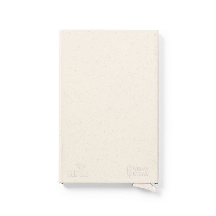 Nature line card holder made of wheat straw. Capacity up to 5 cards, with ingenious slide and extract mechanism. RFID (Radio Frequency Identification) security technology that keeps card data safe. Notch for easy access to the card, with the RFID and the wheat straw distinctive injected in the mold. Wheat straw encourages the use of natural raw materials, reducing pollutant emissions. (neutral color)