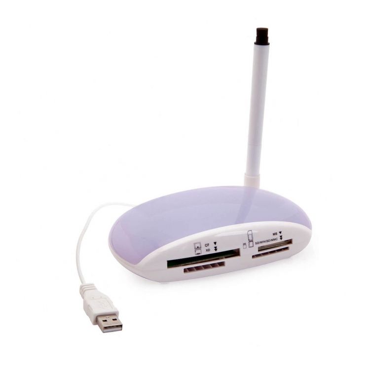 Original card reader with original bicolor curved design and translucent backlit top cover. With marker for writing messages in the backlit area and compatible with SD, MiniSD, mmC, XD, XS, CF cards. Presented in an individual black box. (neutral color)