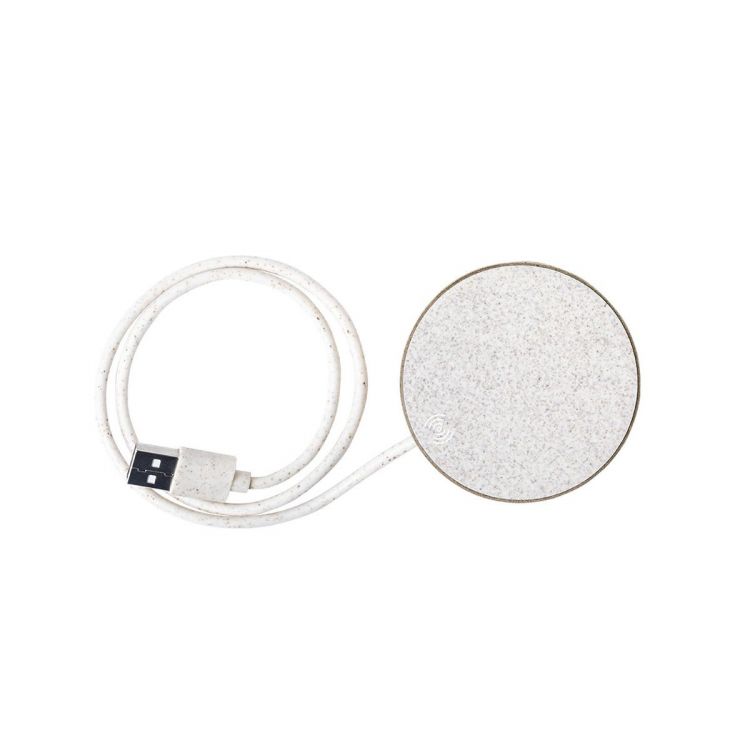Genuine, nature line, round design wireless charger. Recycled cardboard case, contributing to the conservation of forests and considerably reducing the carbon footprint. With charging surface and cable in wheat cane and inside compartment to store the cable and take it with you anywhere. LED charging status indicator, compatible with smartphones with wireless charging technology. Presented in an attractive, eco-design box, with user manual in English and Spanish. (neutral color)