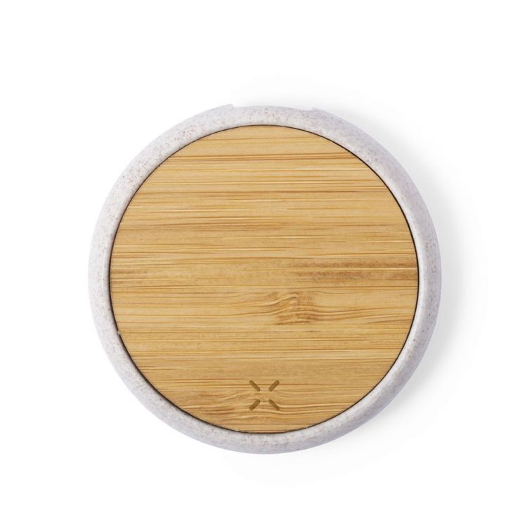 Wireless charger with a circular design. Charging surface in bamboo and shell made of wheat straw, in order to encourage the use of natural raw materials and reduce contaminant emissions. Led indicator, including micro USB charging cable and compatible with devices equipped with wireless charging technology. Safety protection to avoid overheating, overcharging and short-circuiting. Presented in an attractive box of nature design. (neutral color)