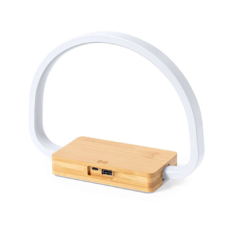 Eco design charger lamp. Made of bamboo from natural cuttings and with non-slip base. Integrated 10W wireless charger. Includes 52 LEDs and 3 lighting positions (warm, cold and medium), with adjustable light intensity. Compatible with mobile devices with wireless charging and USB connection. Includes Type C charger cable and comes in an attractive eco-design box. Available instruction manual in Spanish and English. (neutral color)