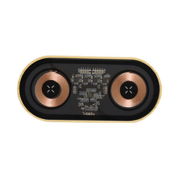Dual 15W wireless charger in an original design with a transparent surface, showing the internal components of the device. With bamboo base, compatible with devices with Qi technology, and also enabling two devices to be charged at the same time. Type C connection, with instructions manual in English and Spanish. Presented in an individual box of kraft design.Materials such as bamboo encourage the use of natural raw materials, reducing pollutant emissions. It comes from a highly resistant and versatile plant with rapid growth and regeneration, making of it an excellent alternative to traditional wood.Manufactured according to RoHS standards and in compliance with the following safety requirements: Overheating protection system. Over-charge protection system. Blocking system to prevent short circuits. (neutral color)