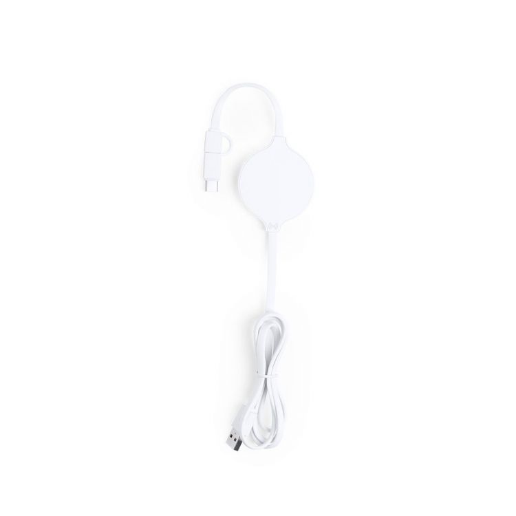 Wireless, ultra compact size charger in monochrome, white color. Connections dual micro USB and Lightning, with Type C adapter, and charging light indicator. Compatible with devices equipped with wireless charging technology. (white color)