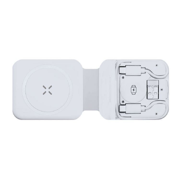 Complete 15W wireless multicharger with 3 in 1 foldable gadget stand. Designed for simultaneous charging of smartphone/headphones and smartwatch: an all-in-one charging station. Includes set of Type C cables and USB adapter, suitable for data transfer. (white color)