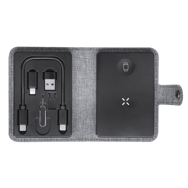 Complete charging base made of 300D RPET. Compact case with button fastener and including Qi wireless charging dock for smartphones, earphones and smartwatches. Supplied with Type-C connection cable at both ends, plus USB and lightning/micro USB adapters. The set is completed by a SIM card ejector and a compartment for storing a Micro SIM card. With RPET logo.RPET material is made from recycled plastic, thus promoting the reuse of plastic waste and helping the sustainability of the planet. (grey color)