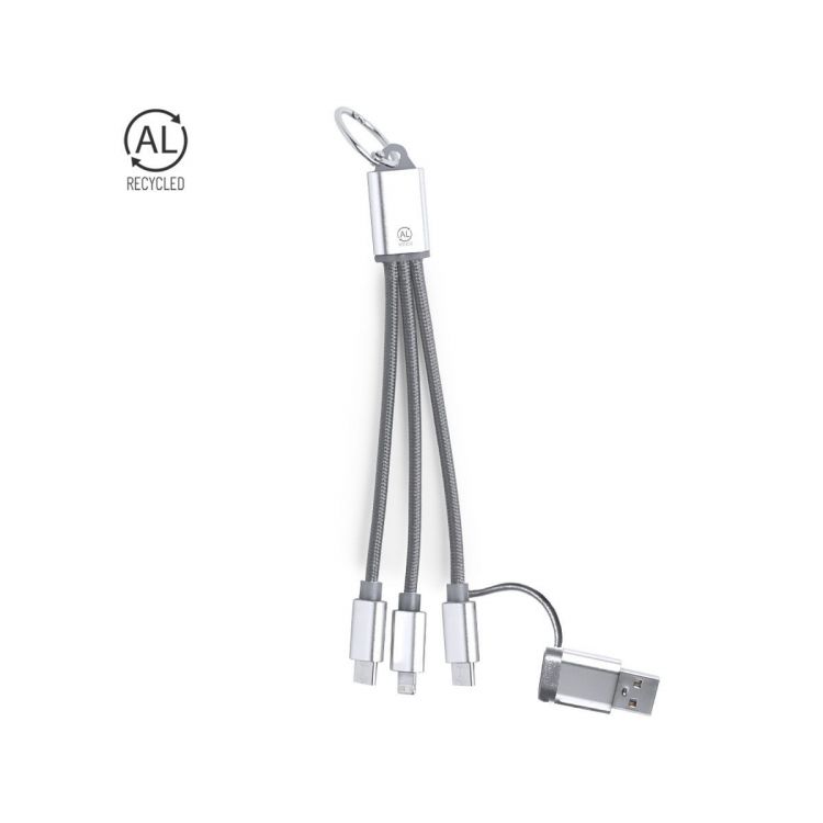 Charging cable made from Recycled Aluminum. With dual input Type C/USB and Type C, Lightning, and Micro USB outputs. Includes a Recycled Aluminum label.Recycled Aluminum is a material with almost infinite recycling possibilities, without losing its original properties and consuming less energy in the process.GRS (Global Recycled Standard) certification, which guarantees the recycled origin of the material used to manufacture the product.Micro USB, Type C, and Lightning connection 5V DC 2.4A.