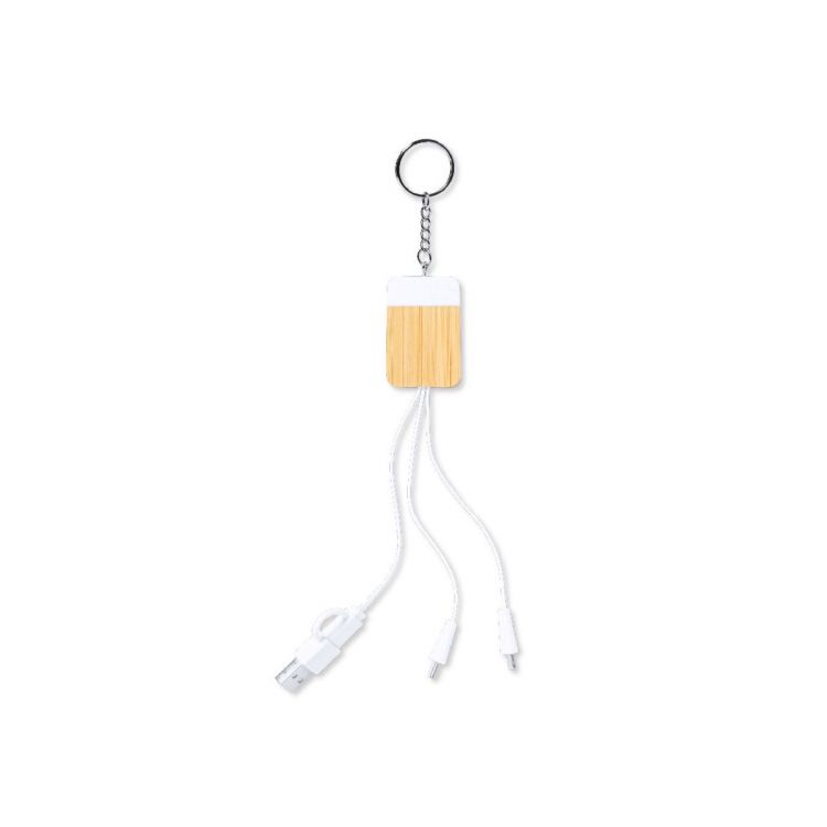 Charger cable with keyring, made in bamboo with marble extract insert. Including USB and Type-C input connections, with Lightning, Micro USB and Type-C 5VDC 2.4A outputs. Presented in an individual kraft design bag. (neutral color)