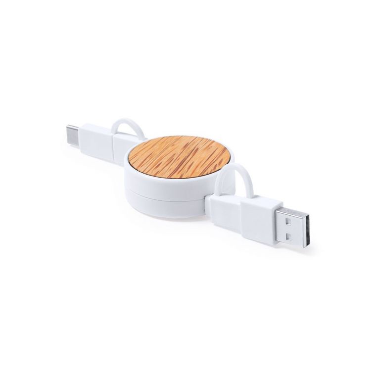 USB extension cable with charger and data transfer function. In nature line and made of coconut from which, after the consumption of its fruit, a multitude of products can be obtained, contributing to the sustainability of the planet and promoting the use of natural raw materials. Type C connections (input and output), and dual Micro USB/Lightning. With flat area for branding and presented in an individual eco-designed box in kraft cardboard. (neutral color)