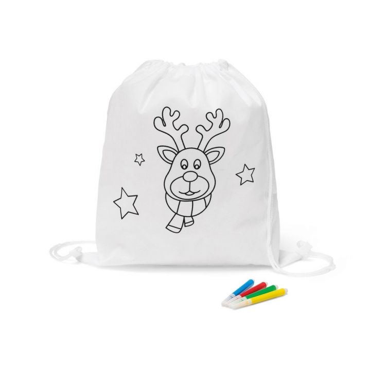 Drawstring bag in non-woven (80 g/m²) with coloring drawing and inner pocket with 4 markers included. Product in white color
