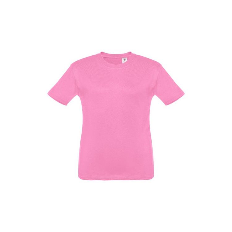 Kids' T-shirt (unisex) in 100% carded cotton jersey (150 g/m²). Contains a 1x1 Rib collar with jersey reinforcement bias tape. Cut and sewn garment, double stitched on the sleeves and hemline. Product in light pink color, size 12